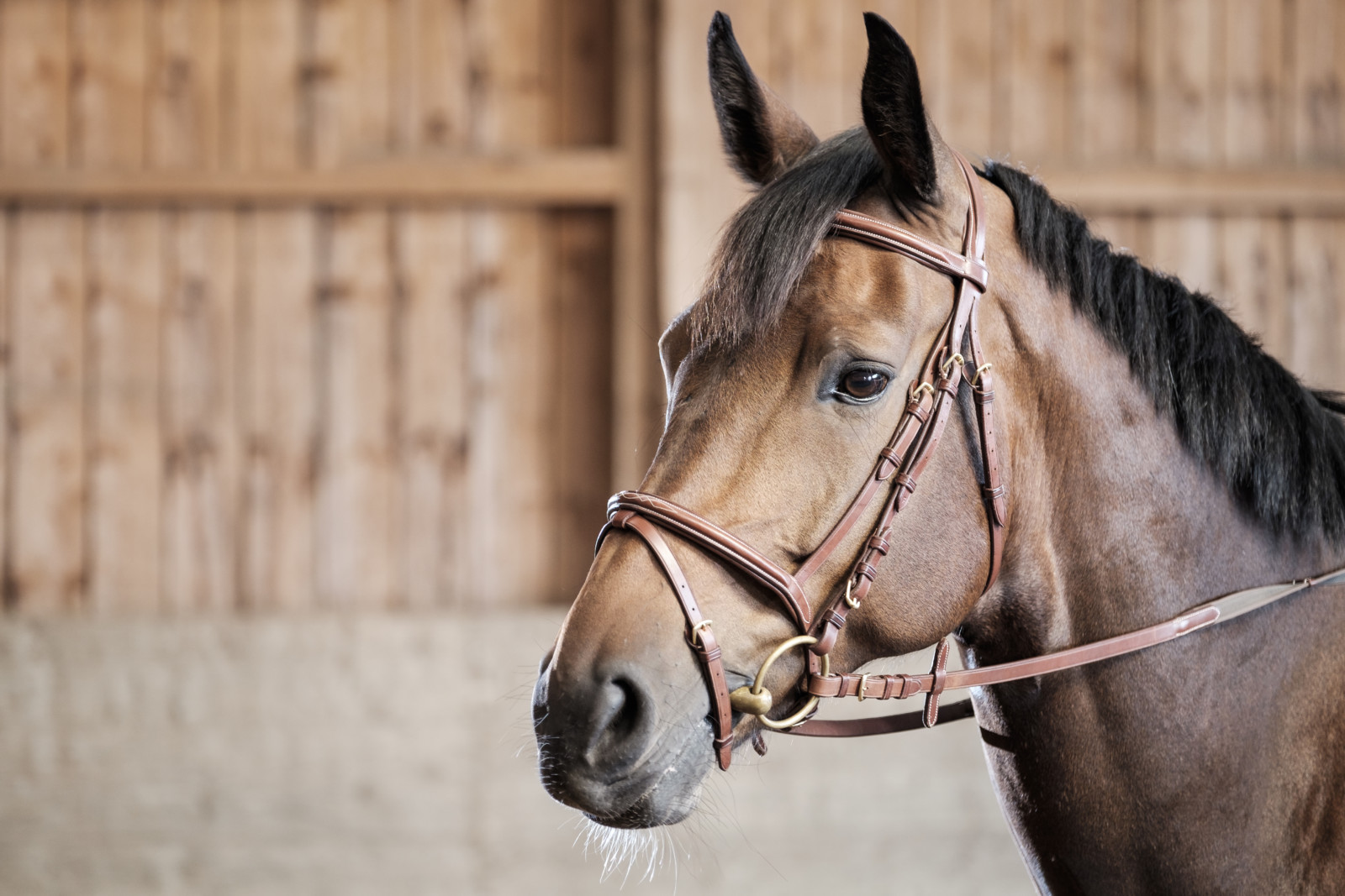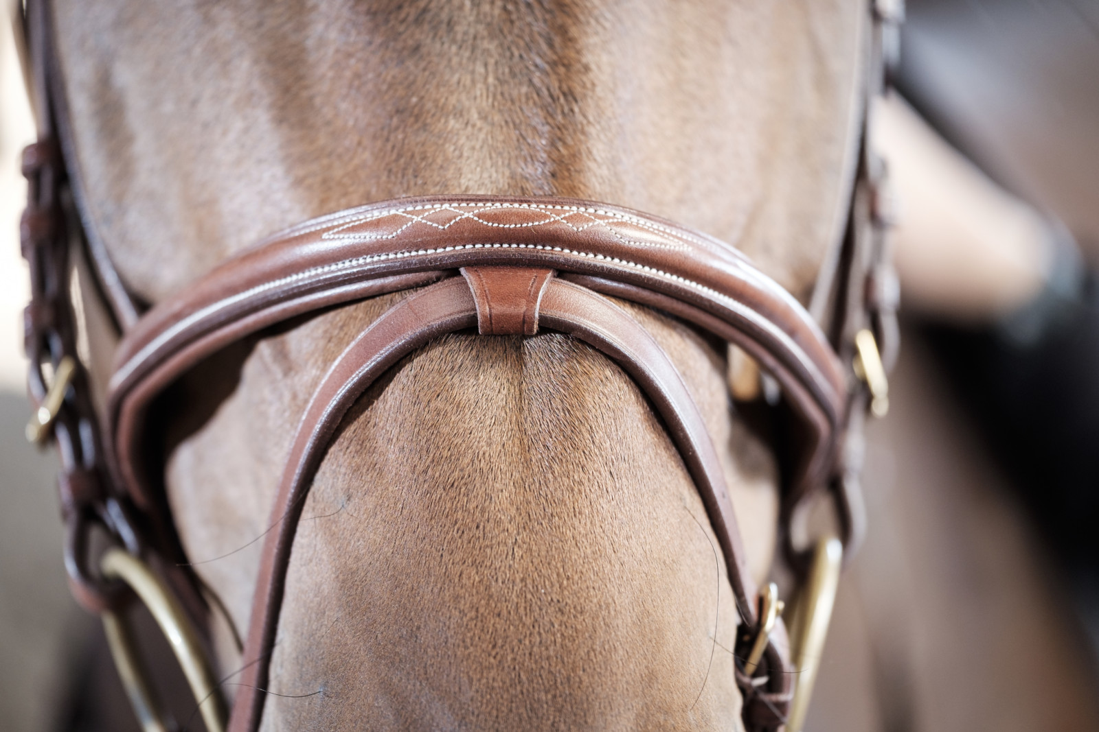 Bride en cuir vachette souple, muserolle irlandaise, frontal et muserolle brodées, têtière découpée et doublée avec du cuir souple, rênes antiglisse