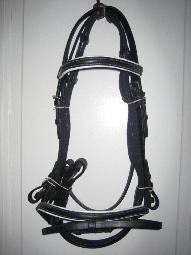 Bride en cuir véritable,frontal et muserolle irlandaise doublé en cuir blanc, avec rênes à taquets.