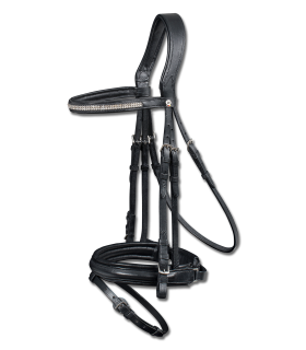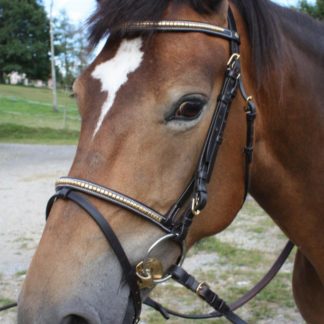 Bride en cuir noir extra grand pour chevaux de traits lourd avec têtière anatomique, muserolle, frontal et têtière doublé. Livré avec de rênes à taquets/19mm Livrable également avec frontal en cuir lisse.