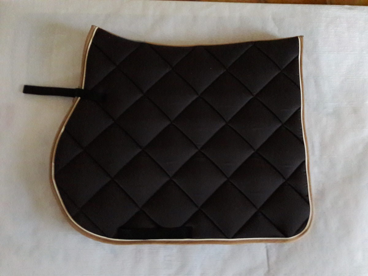 Magnifique chabraque en forme anatomique, brun foncé, bordure beige. Convient pour les selles mixte. L’intérieur en molton doux (100% coton), elle assure une bonne absorption de la sueur et empêche les poils de se casser. Sèche rapidement. 100% coton. Facile d’entretien, lavable à 30°