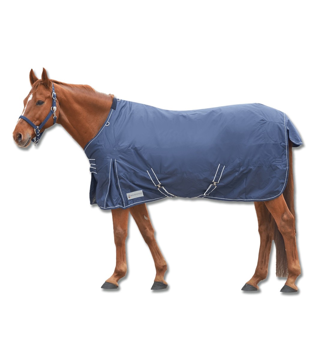 entièrement imperméable laissant toujours respirer et évacuer la transpiration, doublure en tissu polaire, sans couture sur le dos, tissu extérieur très résistant en tissu polyester 600 Deniers. Soufflet d'épaule renforcé. Double fermeture de poitrail, protection de garrot en mouton synthétique. Avec sangles croisées et attaches de jambes.