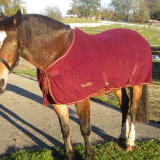 Couverture d'écurie légère avec plis renforcés, en nylon 210 deniers, matelassé, polyfill 200 gr., doublé en coton, double fermeture de poitrail, protection de garrot en mouton synthétique, sangles croisées, courroie sous-queue. Lavable à 30°.