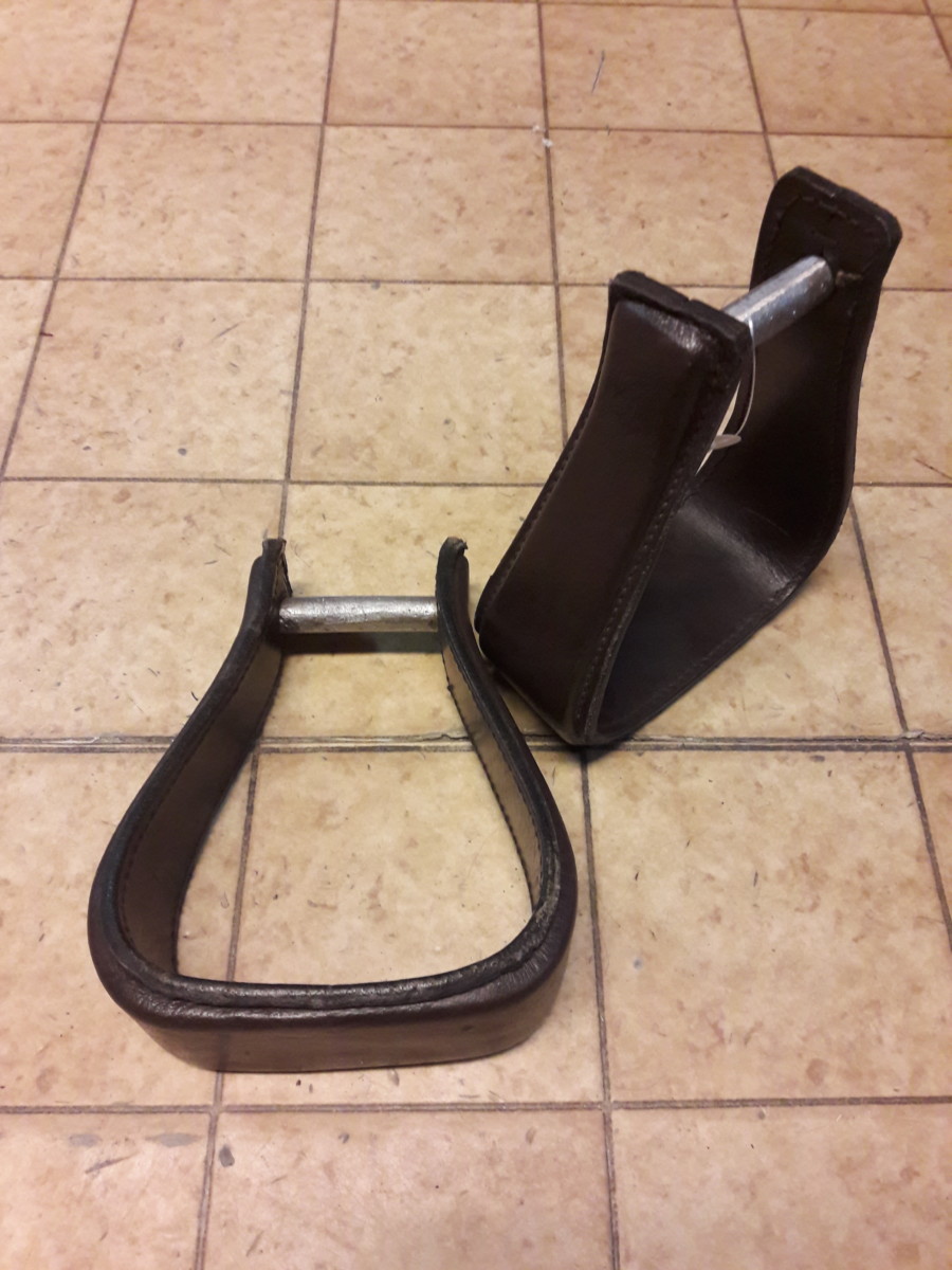 Étriers de matière plastique, recouverts de cuir brun, fonctionnels, larges et stables.