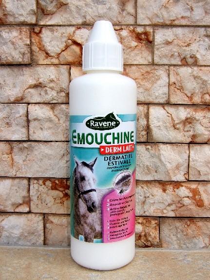Emouchine Derm Lait de Ravene/Paris, pour des chevaux souffrant d'eczemes sa formule permet de calmer les démangeaisons, d'assainir la plaie en profondeur et de la cicatriser. Ses agents insectifuges éloignent les insectes volants, optimisant la cicatrisation, 250ml