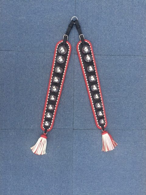 Bordure rouge-blanc, pompon en cuir rouge-blanc, 18 grelots, la paire