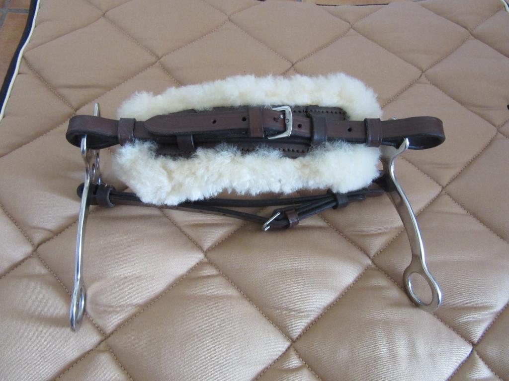 Muserolle en cuir, matelassé en peau de mouton médicinale, fabriqué dans notre atelier, branches de 19 cm en inox, avec gourmette en cuir, taille cheval muserolle en cuir brun claire, brun-foncé, noir Ref. 1102