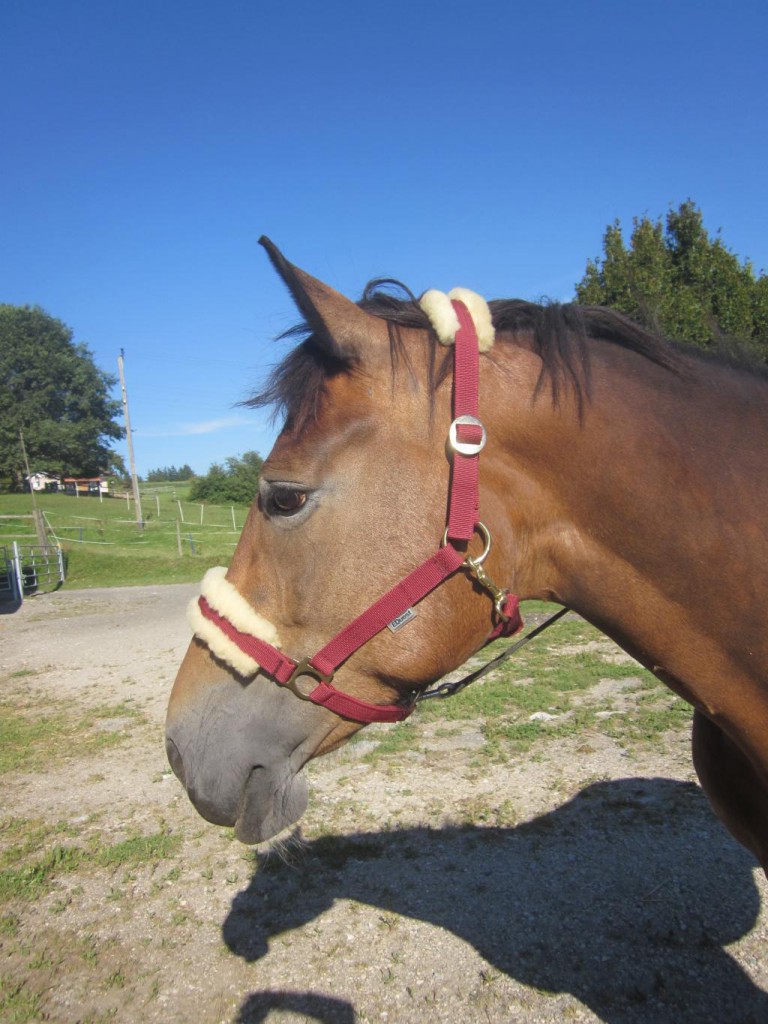 En nylon, fabrication allemande, têtière et muserolle double de peau de mouton, sous-gorge avec mousqueton à ressort, très solide, divers coloris Tailles: 1 = poney, 2 = pur-sang, 3 = demi-sang