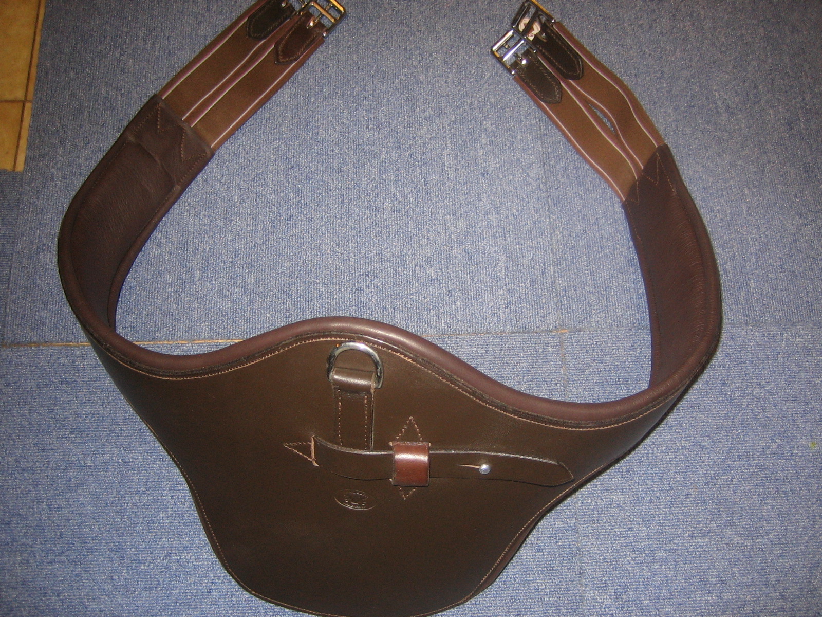 Sangle en cuir avec protection des mordax, matelassé en cuir vachette fin équipée d’une boucle pour attacher le collier de chasse ou martingale. Un confort maximum pour le cheval et la cavalière avec bout élastique de chaque coté. Protège votre cheval lors des concours de saut de blessures sous le ventre, fabrication maison. Bouclerie à rouleau en acier inoxydable.