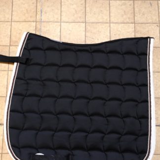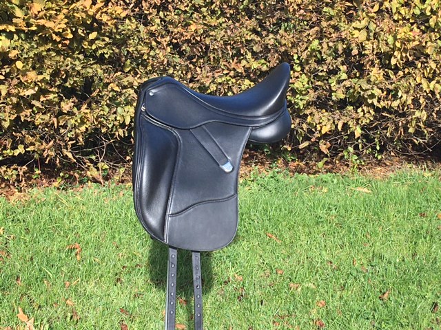 Selle de Dressage Bates en cuir de bœuf noir de haute qualité, arcade interchangeable et coussinet adaptable. Couteaux d’étrivières/porte étrivières réglables de trois positions. Quartiers doublés en cuir vachette souple pour un confort supérieur de la cavalière.