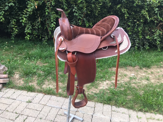 d’une excellente qualité, en cuir anglais de première qualité, siège profond et confortable, doublée en cuir daim rembourrée, arçon « Ralide ». Fabriquée dans notre atelier.