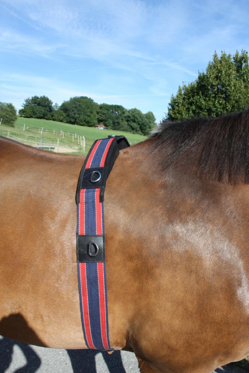 Avec cinq anneaux sur coussin cuir. Sangle tissu de 8 cm de large. Tailles: Demi-sang, Pure sang, Poney
