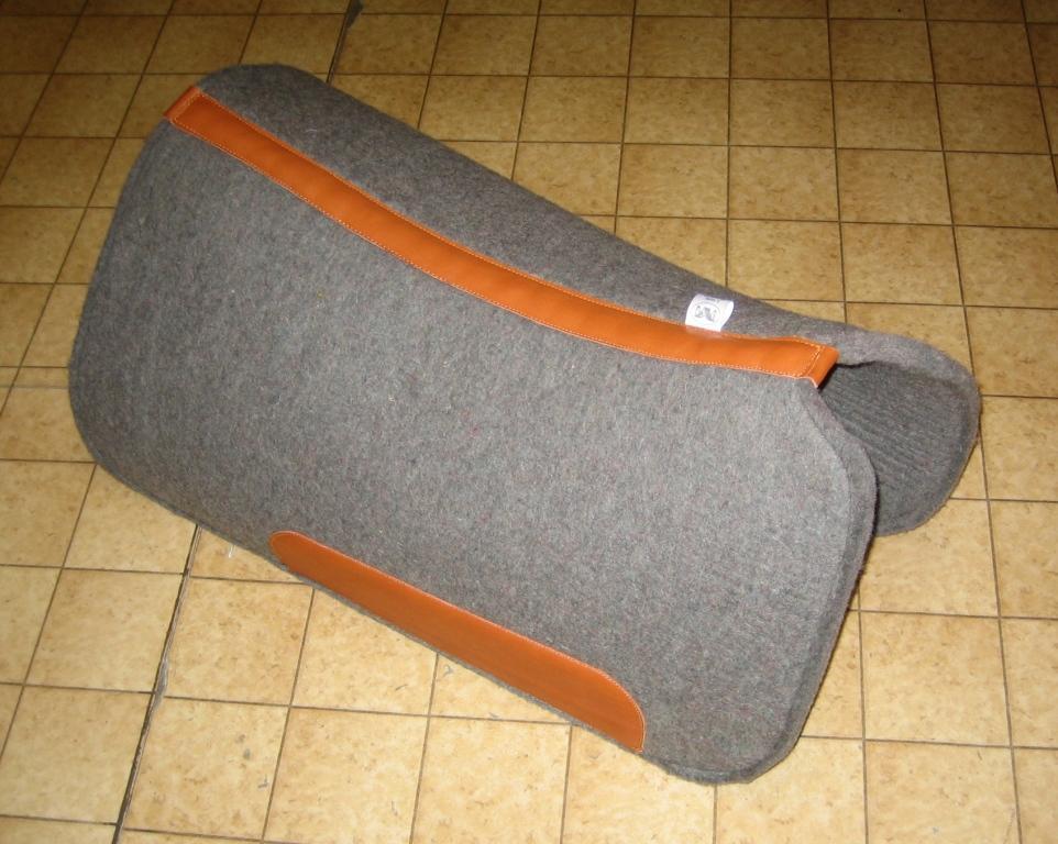 Tapis de selle Western, en feutre gris 15 mm. Ce tapis est coupé et cousu en forme du dos du cheval pour éviter de toucher le garrot et de glisser sous la selle. Absorbe énormément la transpiration. Fabriqué dans notre atelier.